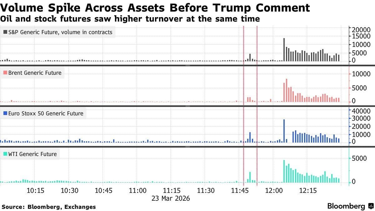- According to Bloomberg, contracts worth at least 6 million barrels of Brent and WTI were sold in the two minutes before Trump’s Iran post, almost tenfold the usual trading volume in oil futures.